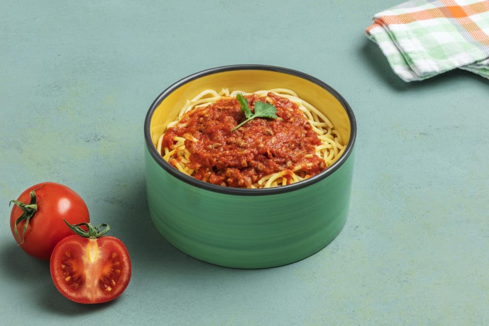 Spaguetti con la tradicional salsa bolognesa a base de salsa de tomate y carne de ternera 100%, jugosos y siempre `al dente.