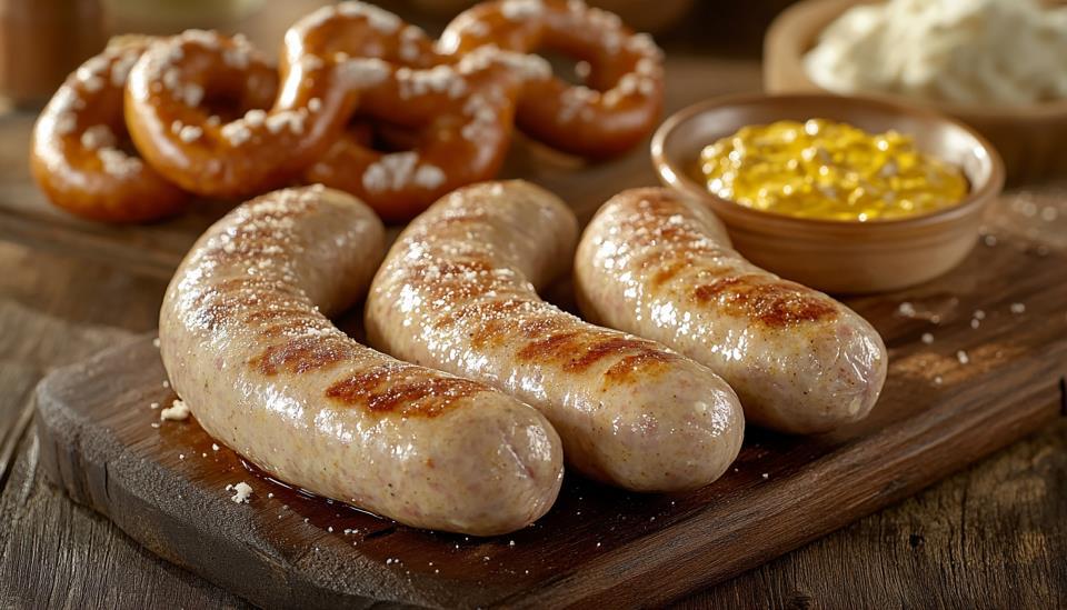 “Receta autentica alemana de la salchicha Bratwurst, salchicha alemana blanca a la parrilla, con tripa natural»
